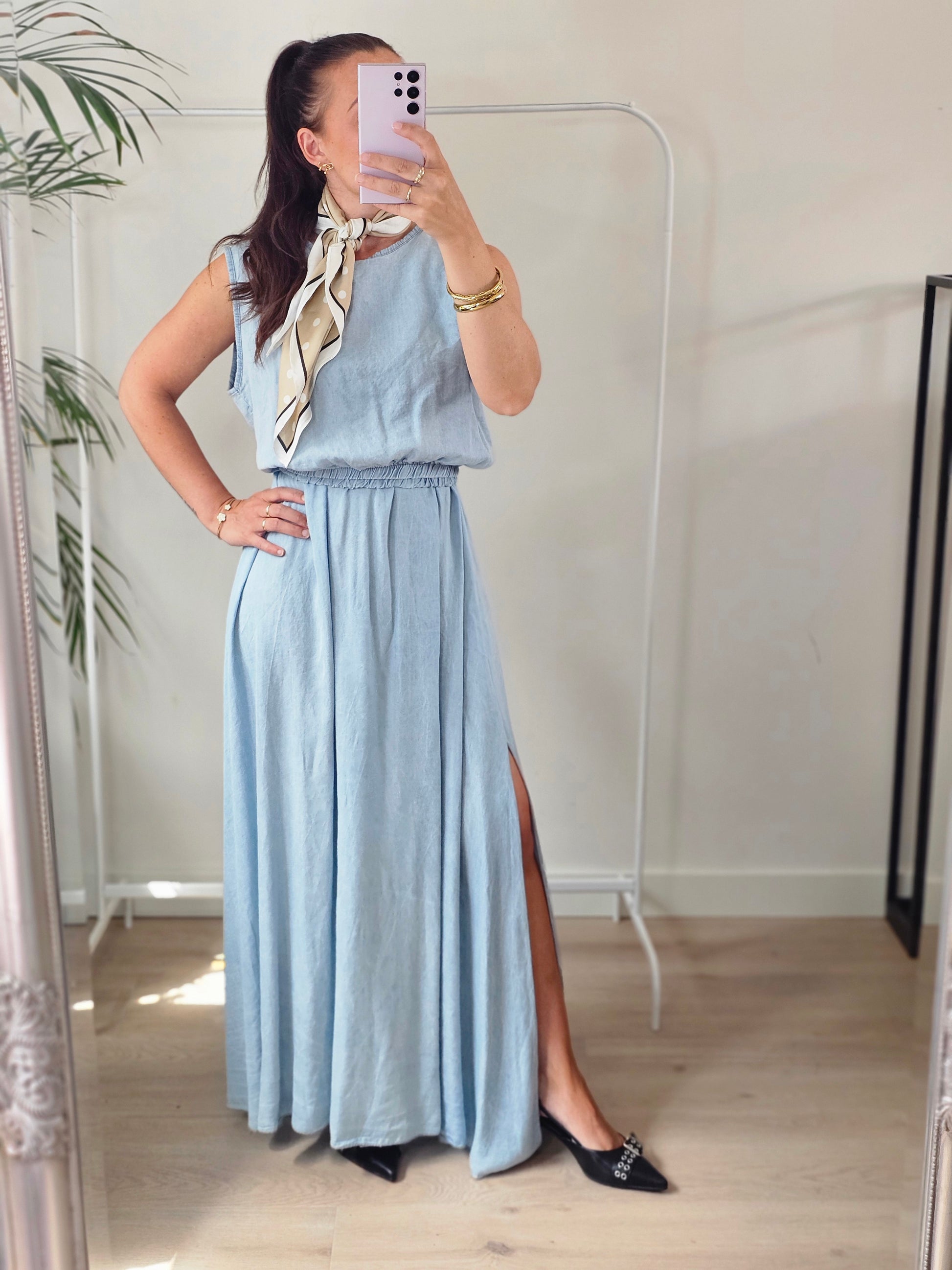Deze stijlvolle twin set bestaat uit een top en een rok in een modieuze denim look, beide voorzien van elastiek voor extra comfort en een perfecte pasvorm. De rok heeft elastiek in de taille en de top sluit mooi af met elastiek aan de onderkant. De stof geeft je een casual-chique vibe met een subtiele, stoere twist.